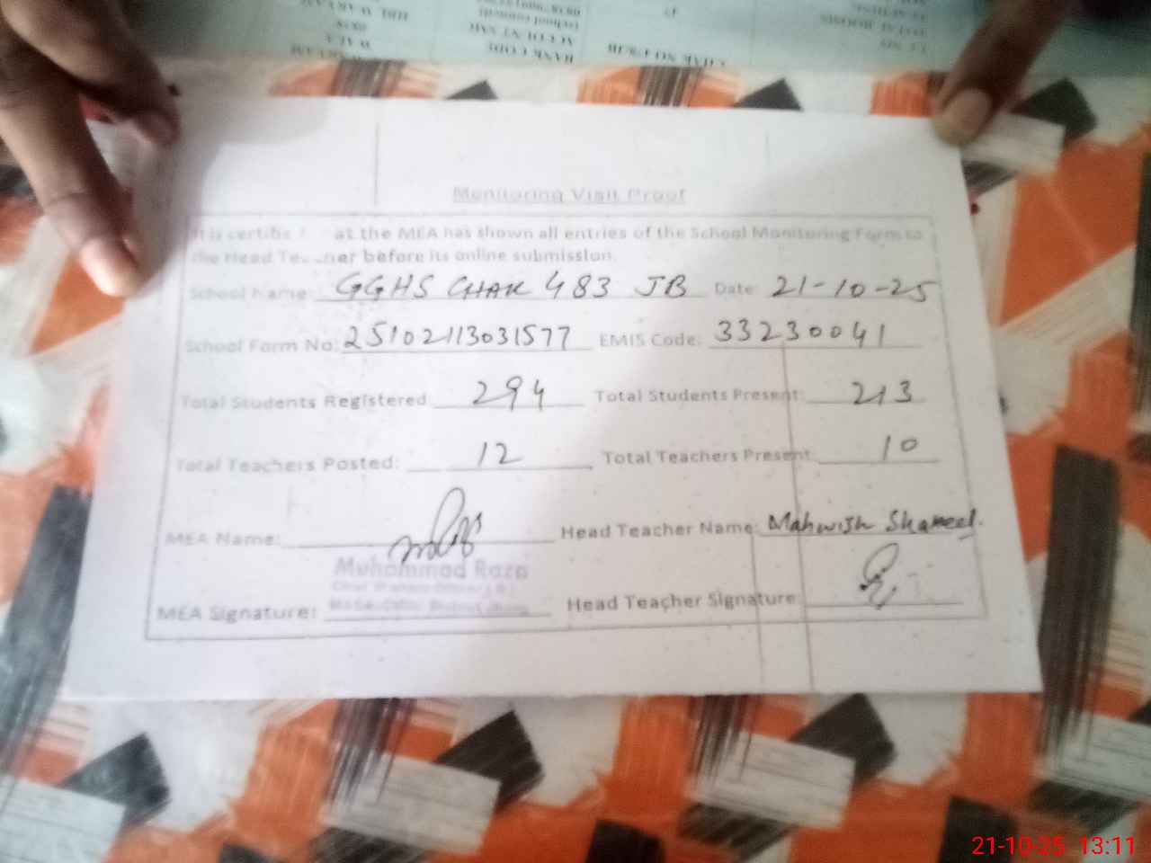 | EMIS Code: 33230041 | Name of School: GGHS CHAK NO 483 JB | |||