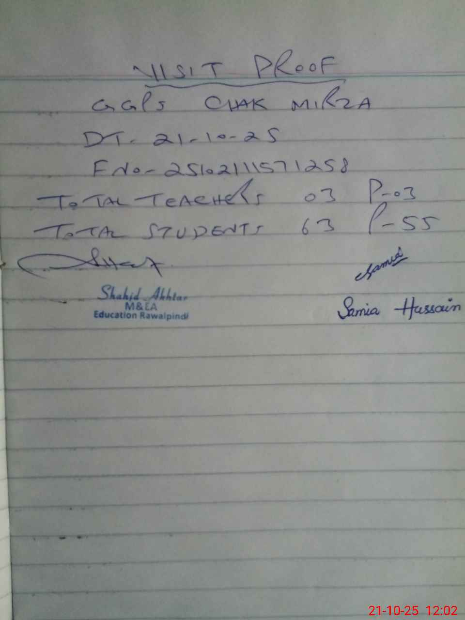 | Attendance Register | Head Teacher | MEA with School | Visit Proof |