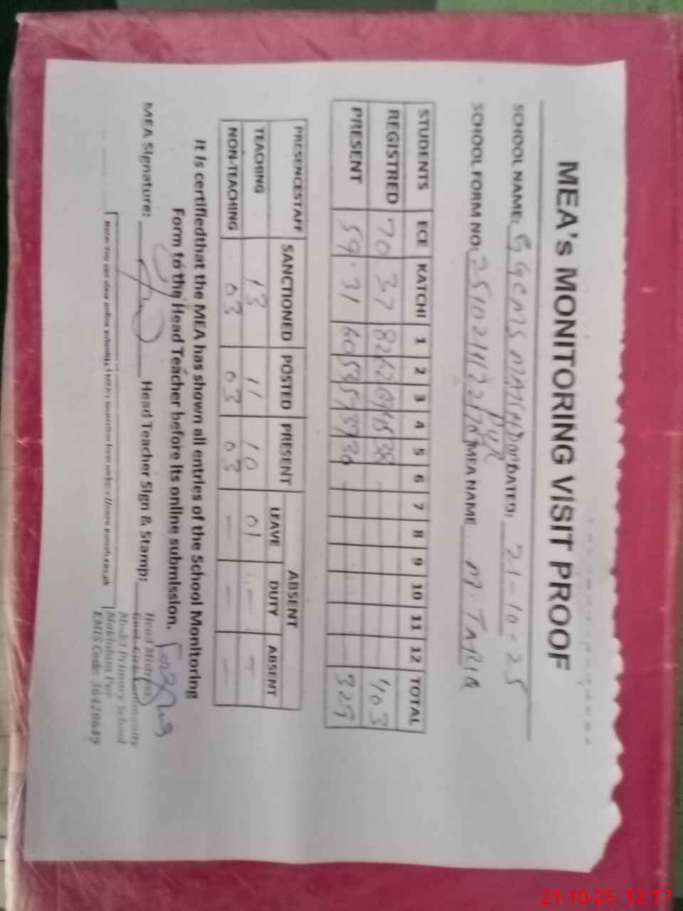 | Attendance Register | Head Teacher | MEA with School | Visit Proof |