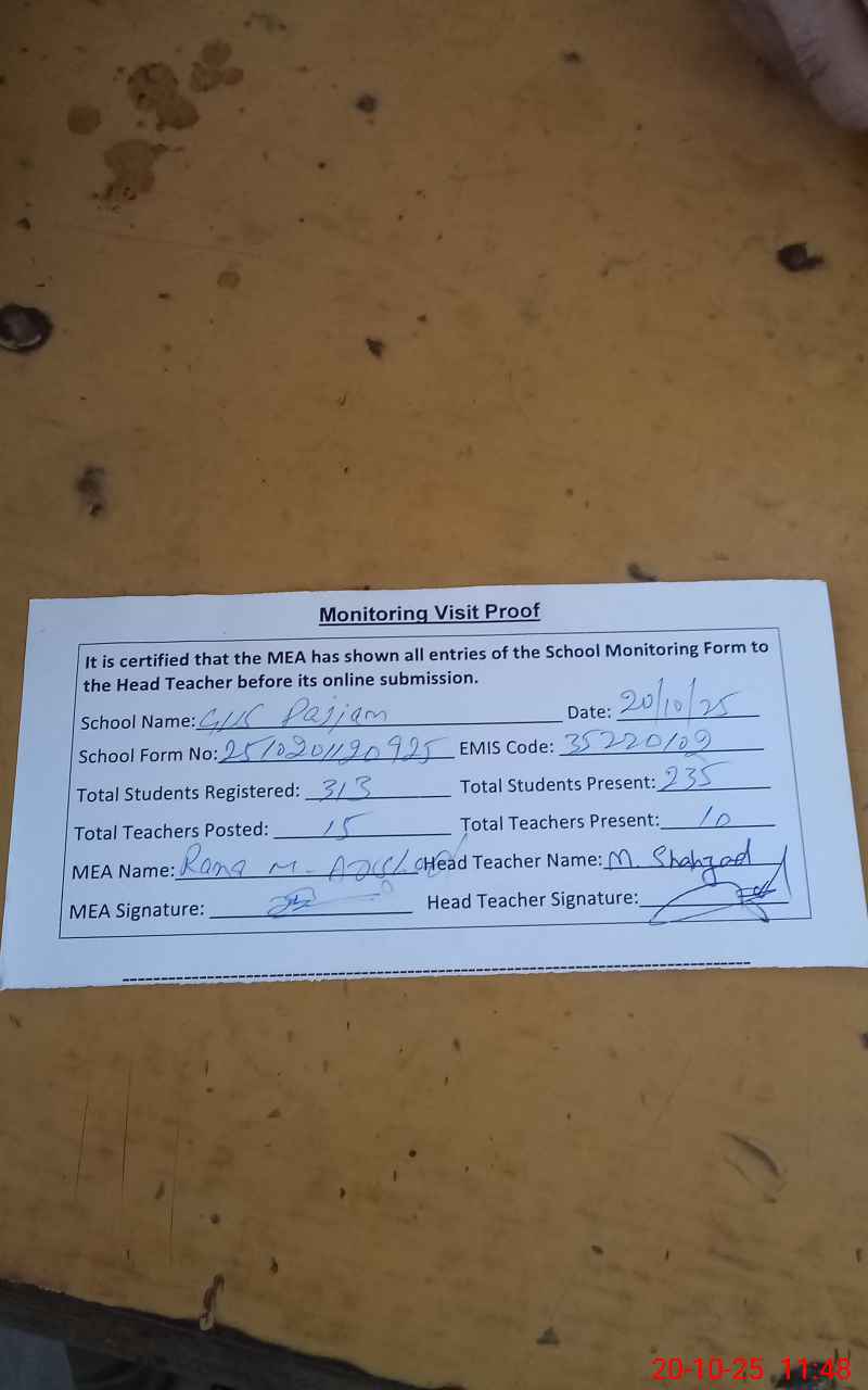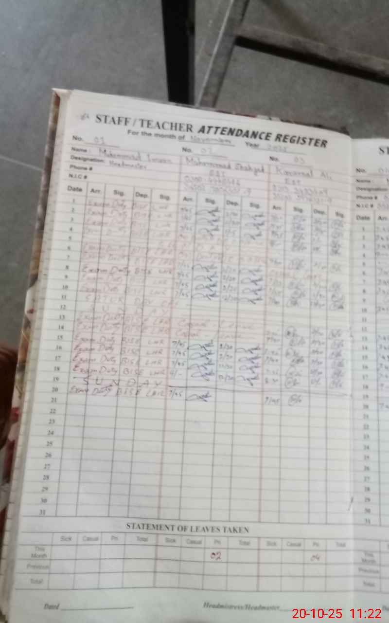 | Remarks (Use Separate Page if Required): Teacher M Imran SST Head teacher on Exam duty but no any duty order available in school so according to monitoring sop mark him Absent today Teacher M Asif PST on Exam duty but no any duty order available in school so according to monitoring sop mark him Absent today Nadeem Salamat PST on casual leave but his sanctioned casual leave was not available on line or manual so according to monitoring sop mark him Absent today Teacher M Rehman PST on casual leave but his sanctioned casual leave was not available on line or manual so according to monitoring sop mark him Absent today Teacher Rashid Ali PST long time Absent from 02 Years Mali Ahsanullah on casual leave but his sanctioned casual leave was not available in school so according to monitoring sop mark him Absent today SG M Ali on temporary duty but no any duty order available in school so according to monitoring sop mark him Absent ???? ??? ?? ?? ??? ??? ????? ??? ?? ????? ??? ??? ????? ???? ?????? ??? ???? ???? ?? ???? ??? ?? ???? ?? ??? ?? ???? ?????? ???? ?? ???? ???? ???? ?? ??????? ??? ?????? ???? ??? ???? ????? ?? ??? ???? ?? ??? ?? ?? ?? ????? ????? ????? ????? ??? ???????? ?? ????? ???? ?????? ???? ?????? ??? | |||||