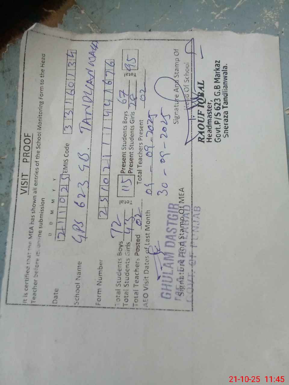 | EMIS Code: 33160134 | Name of School: GPS CHAK 623 GB TANDLIANWALA | |||