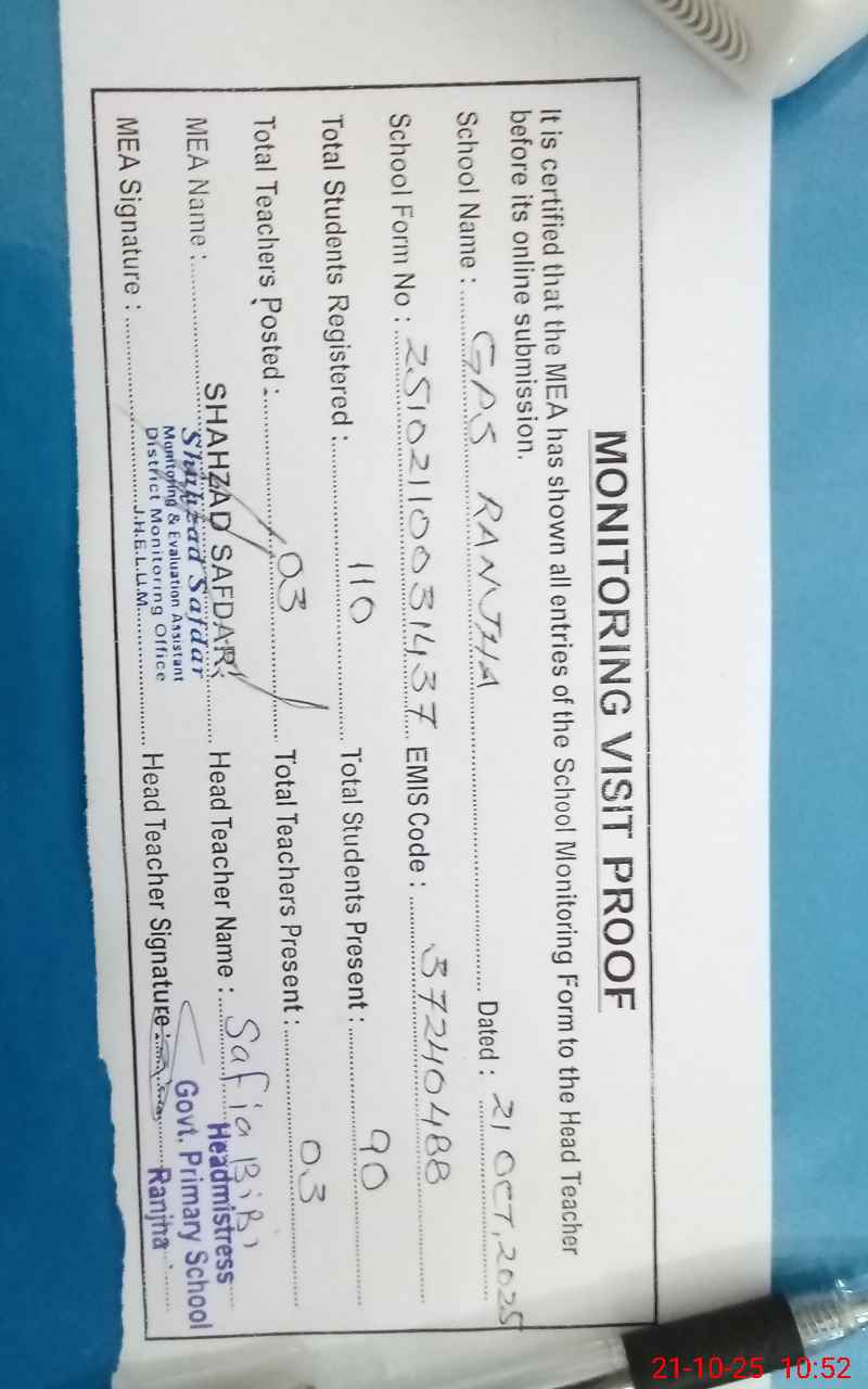 | EMIS Code: 37240488 | Name of School: GPS RANJHA | |||
