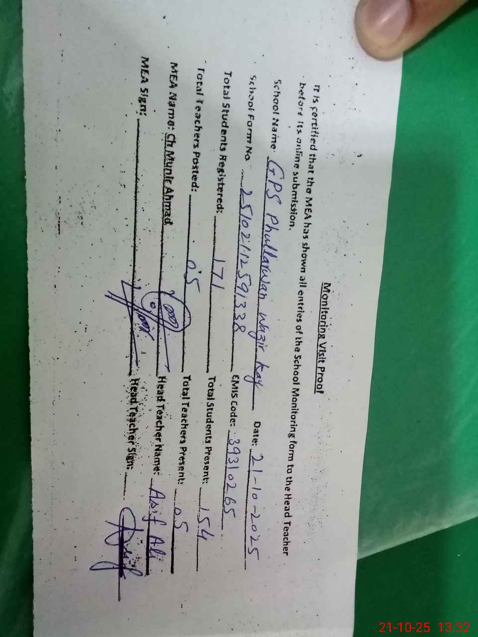 | EMIS Code: 39310265 | Name of School: GPS PHULER WAN WAZIR KE | |||