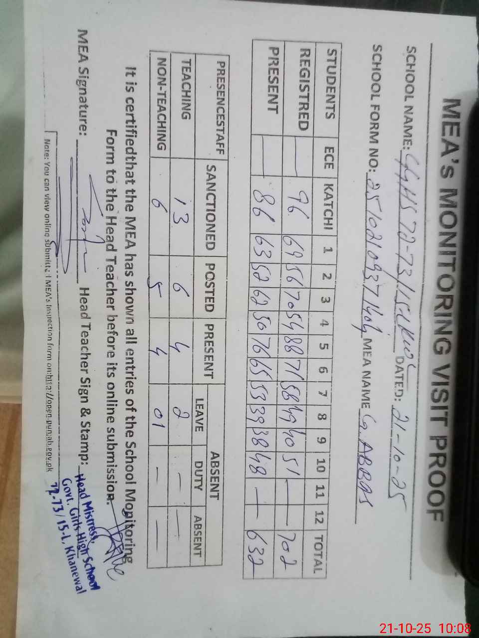 | Attendance Register | Head Teacher | MEA with School | Visit Proof |