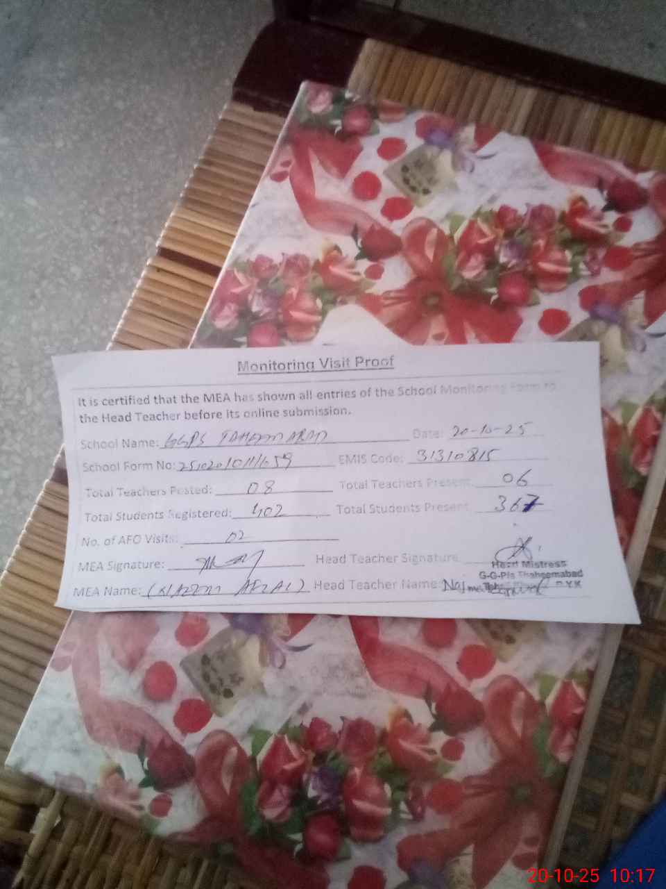 | Attendance Register | Head Teacher | MEA with School | Visit Proof |