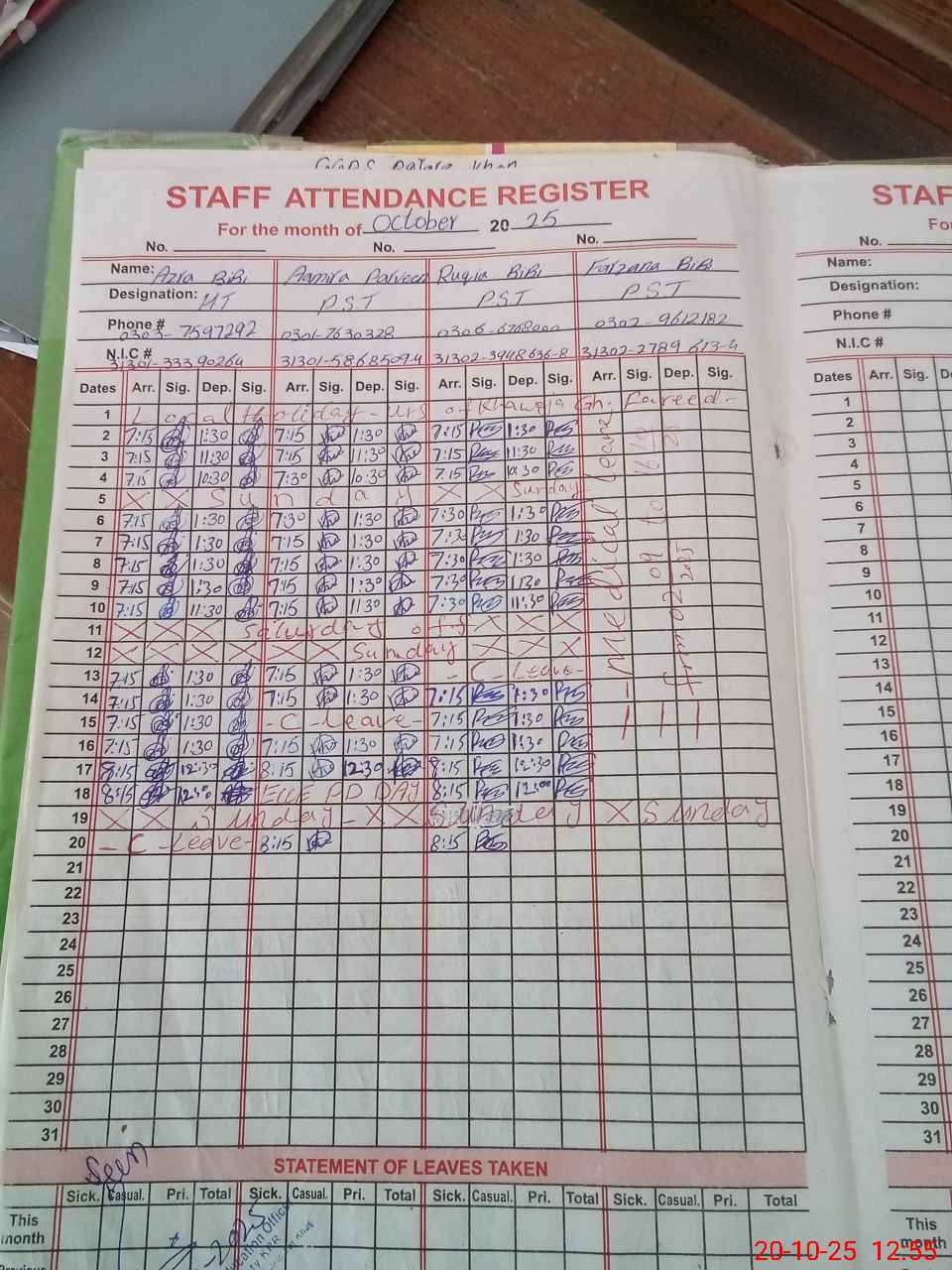 | CNIC | Full Name | Designation | R/C | Absence During Last Calender Month |