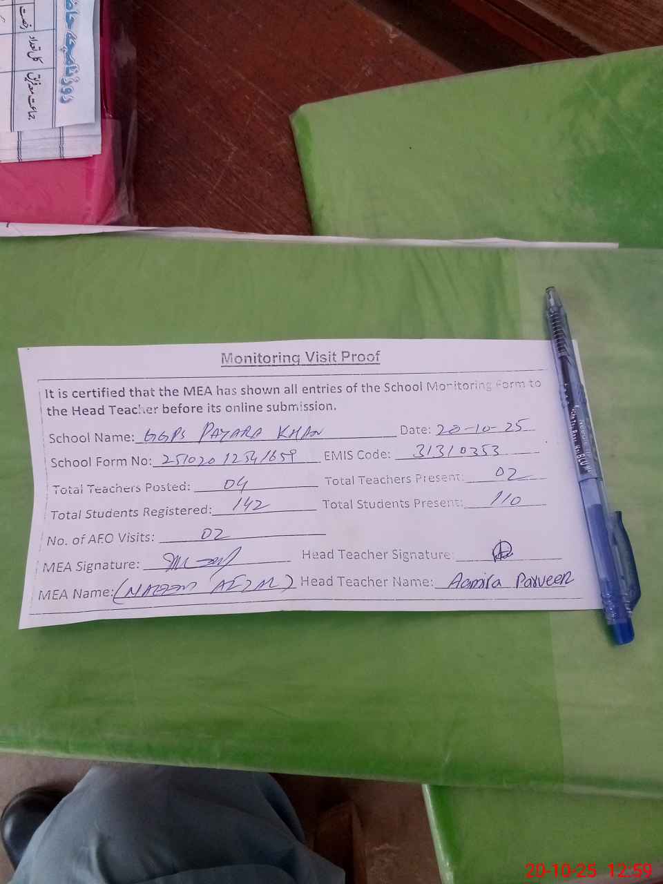 | Attendance Register | Head Teacher | MEA with School | Visit Proof |
