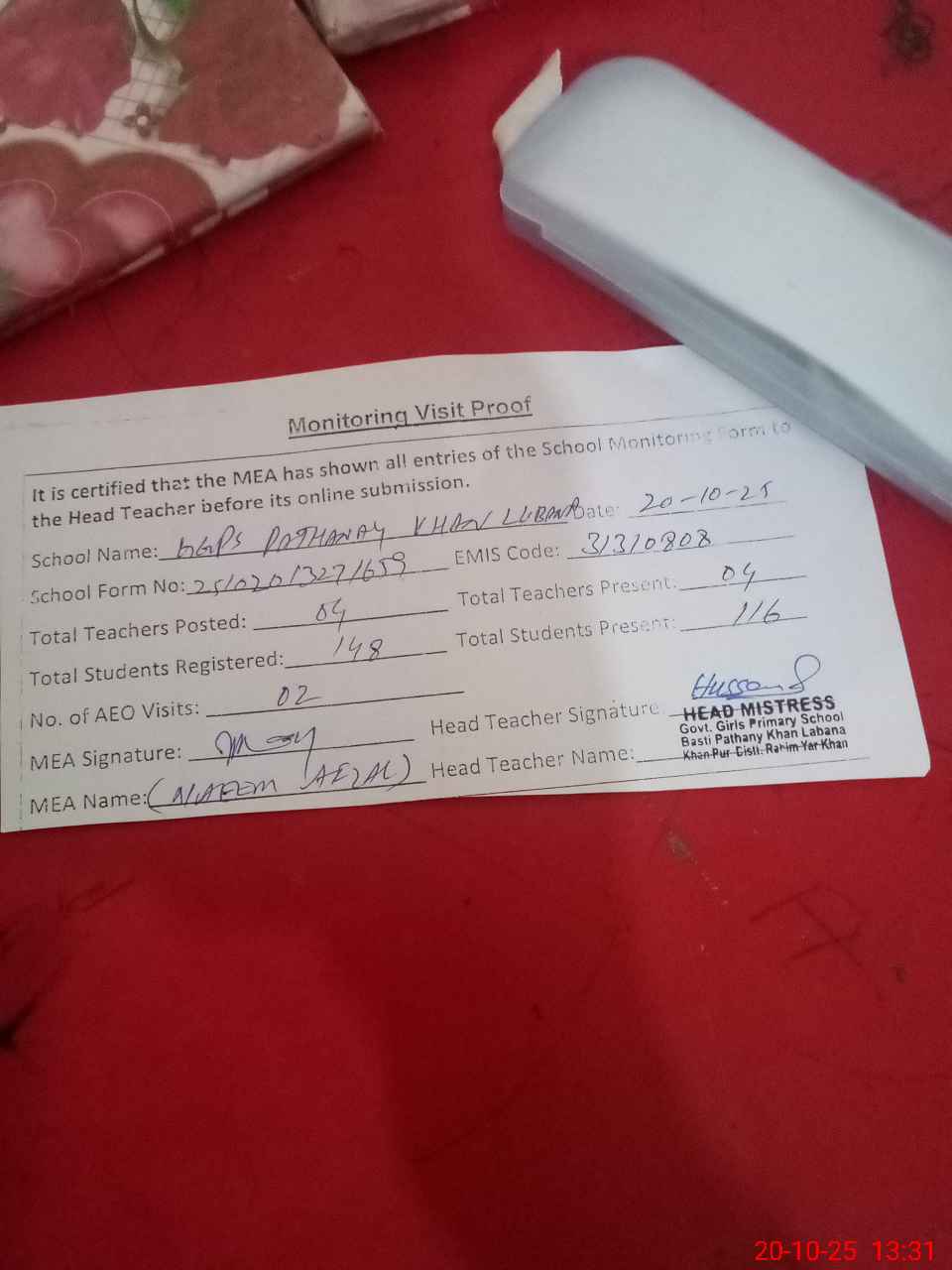 | Attendance Register | Head Teacher | MEA with School | Visit Proof |