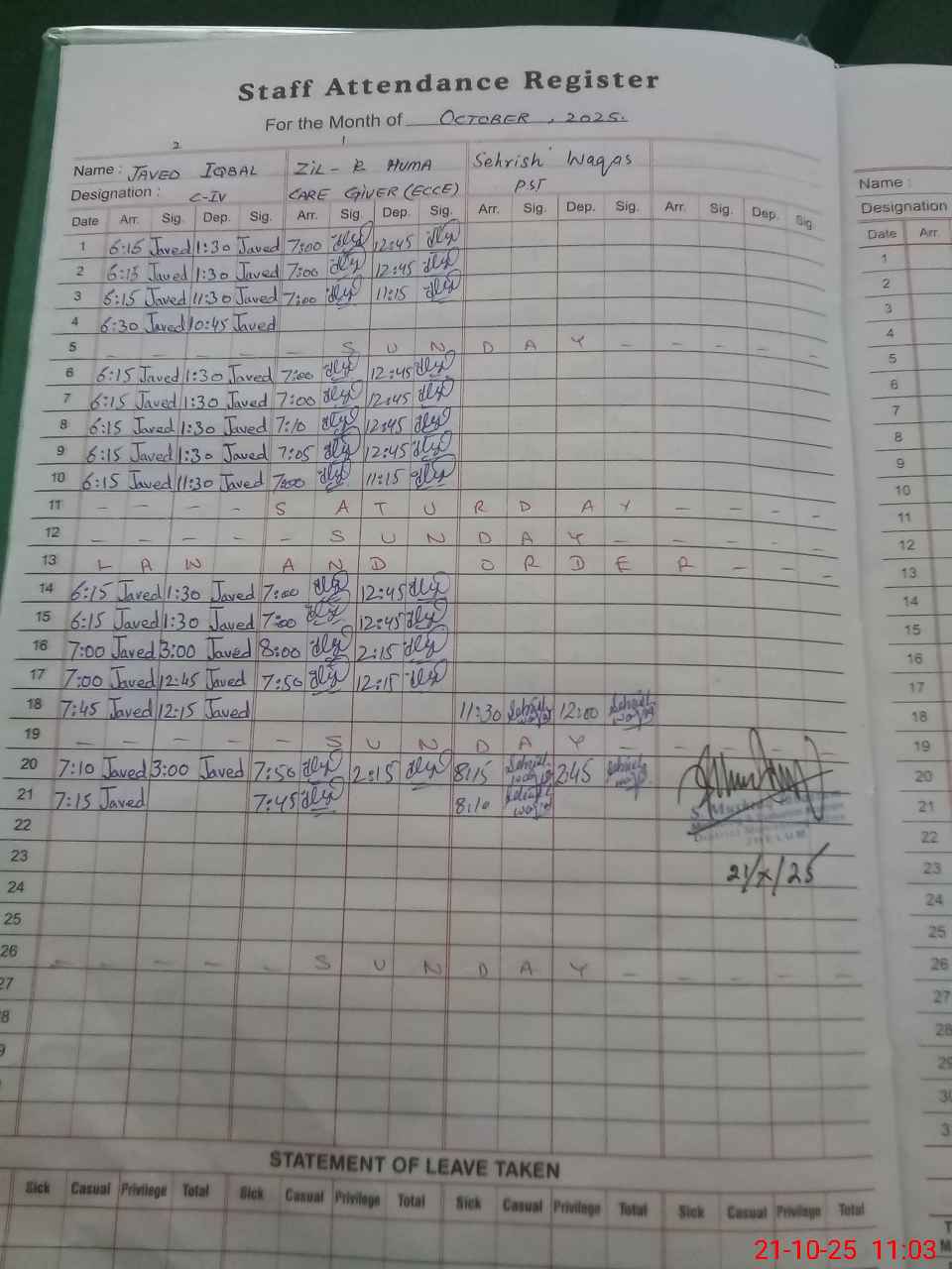 | CNIC | Full Name | Designation | R/C | Absence during last cal. month |