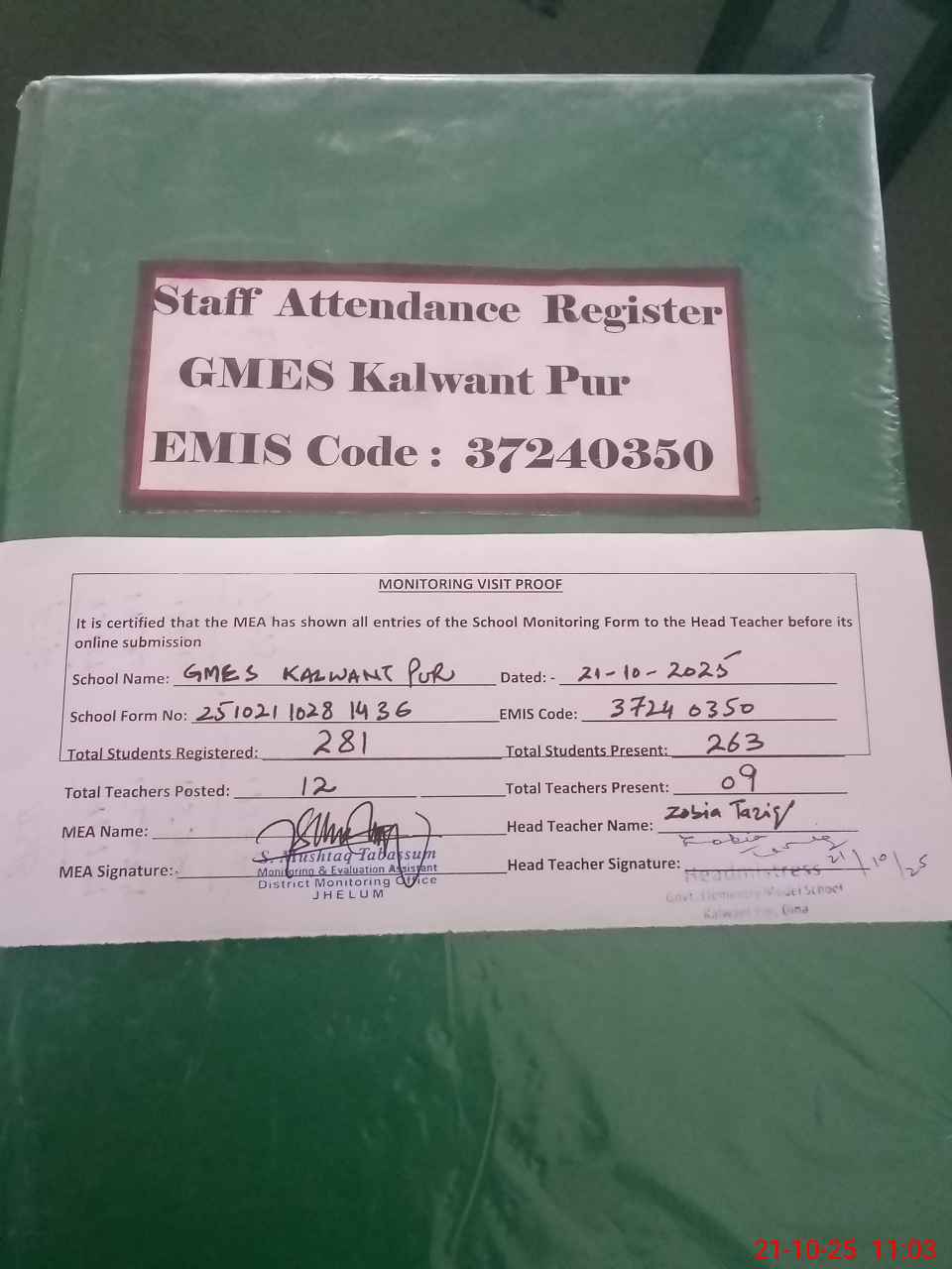 | Attendance Register | Head Teacher | MEA with School | Visit Proof |