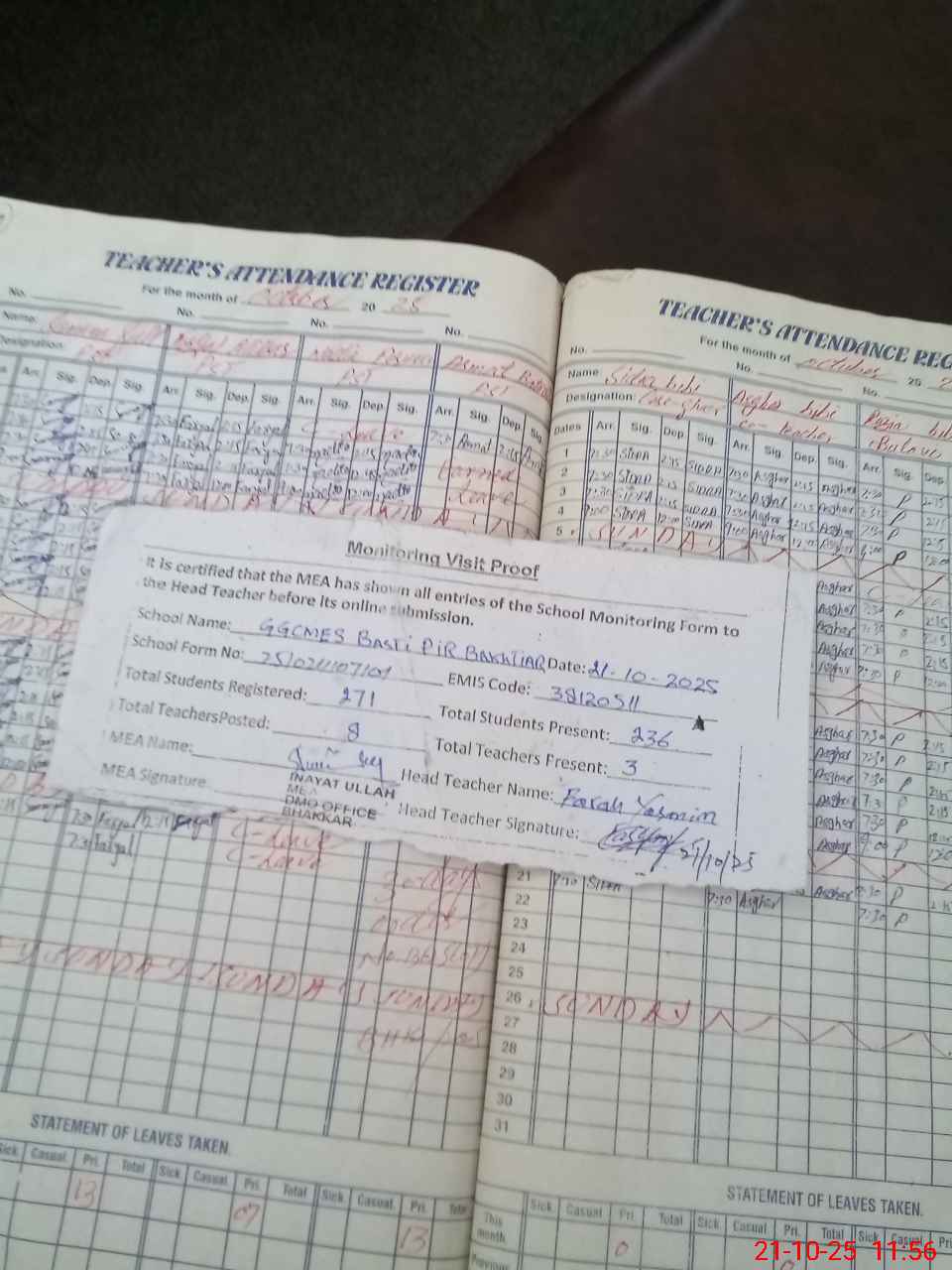 | Attendance Register | Head Teacher | MEA with School | Visit Proof |