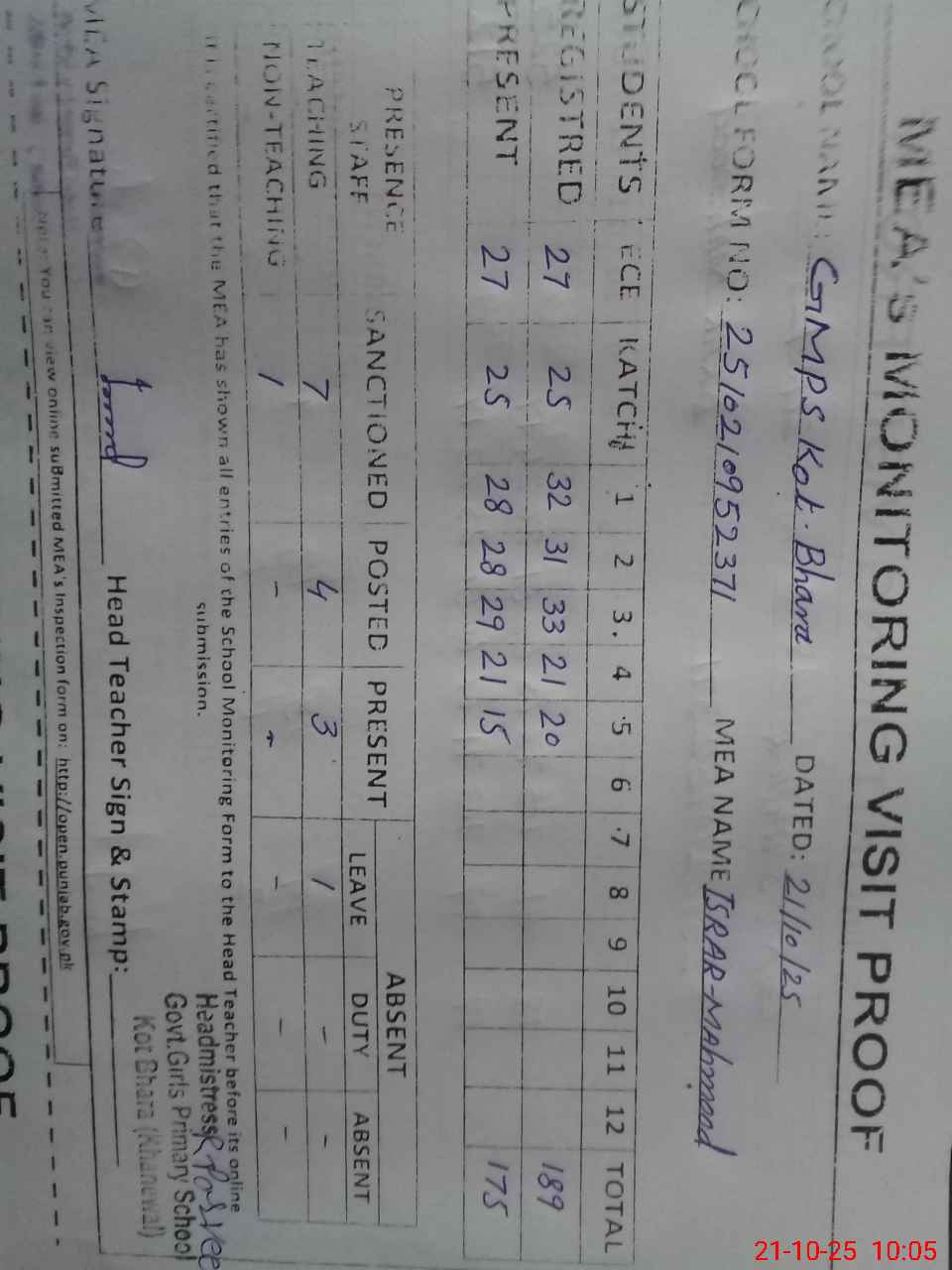 | Attendance Register | Head Teacher | MEA with School | Visit Proof |