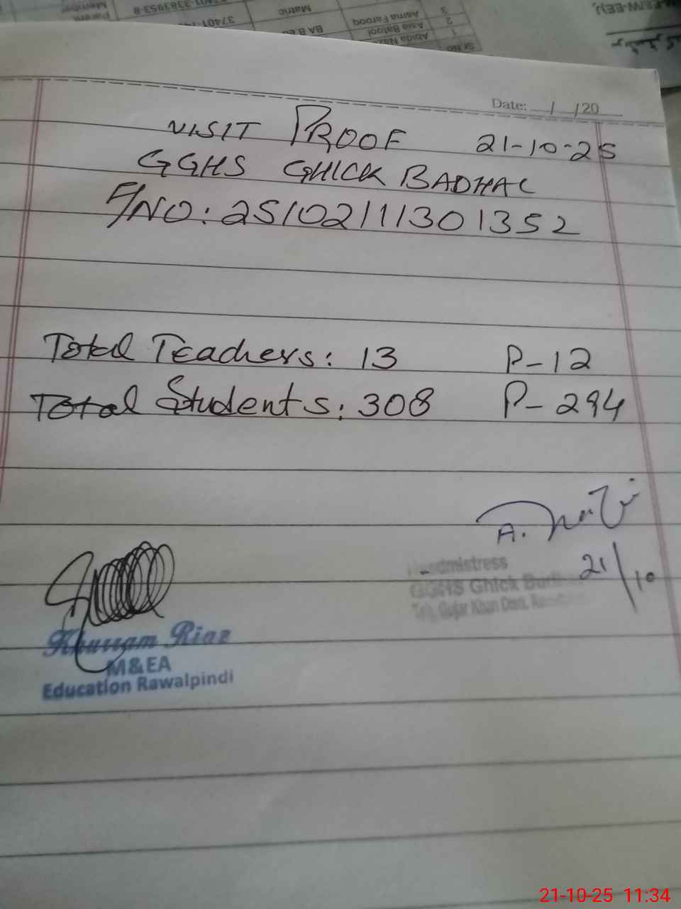 | Attendance Register | Head Teacher | MEA with School | Visit Proof |
