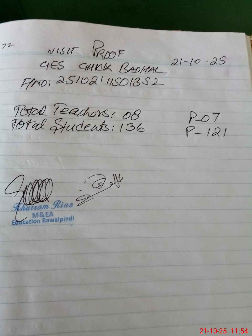| Name: MU**** WA**** SH**** Designation: (School Headmaster's/Headmistress's) HEADMASTER Phone/Cell Number: 03**** |