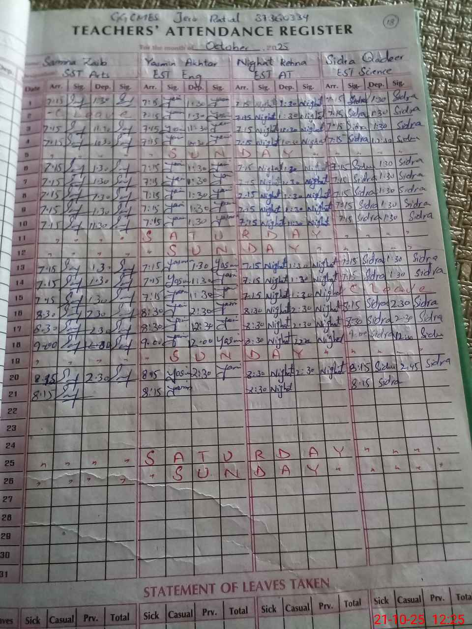 | Leave | Duty | Absent | Maternity | Medical | Ex- Pak |