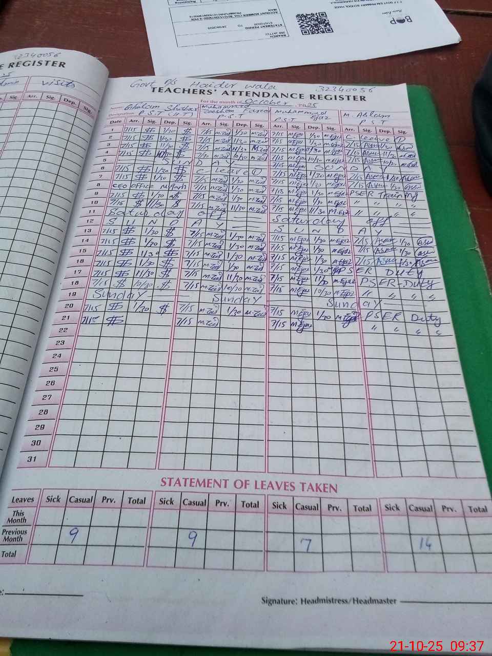 | Name: M.**** Designation: (School Headmaster's/Headmistress's) PST Phone/Cell Number: 03**** |