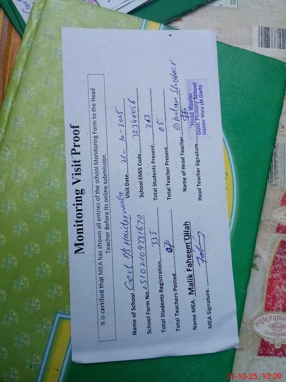 | Attendance Register | Head Teacher | MEA with School | Visit Proof |