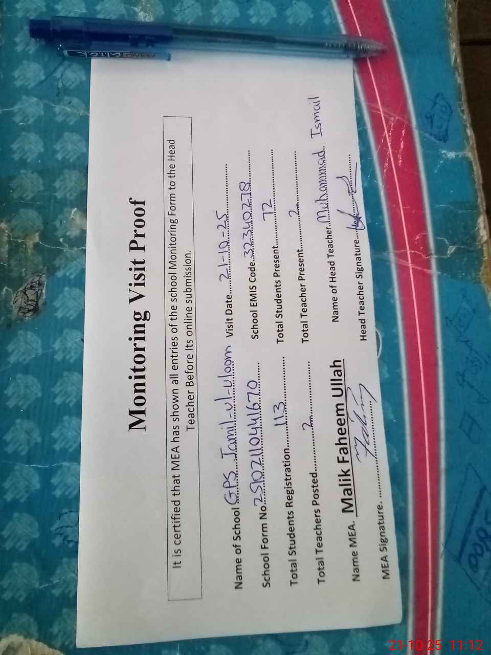 | Attendance Register | Head Teacher | MEA with School | Visit Proof |