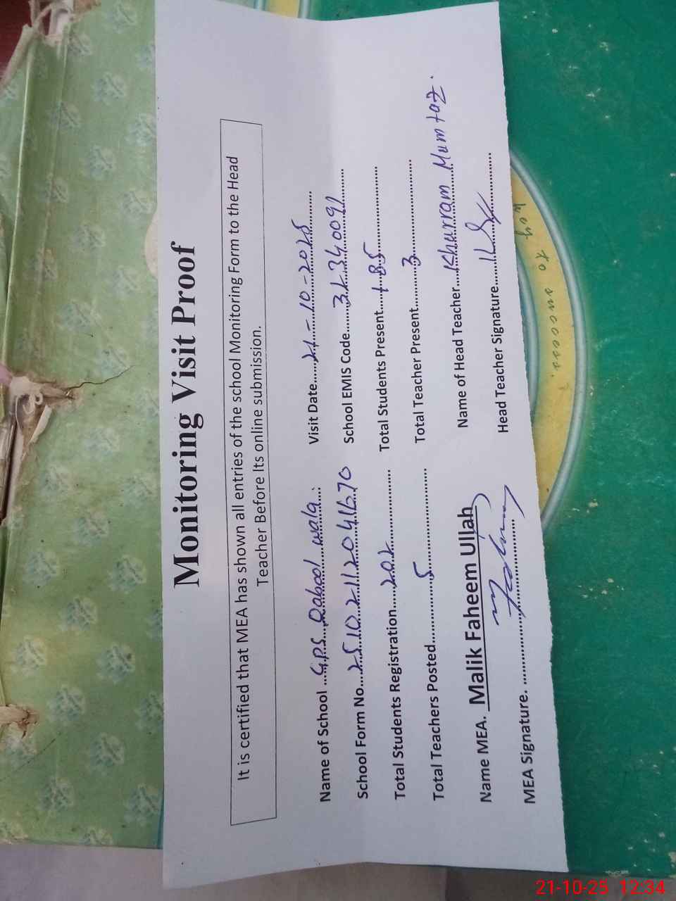 | Attendance Register | Head Teacher | MEA with School | Visit Proof |
