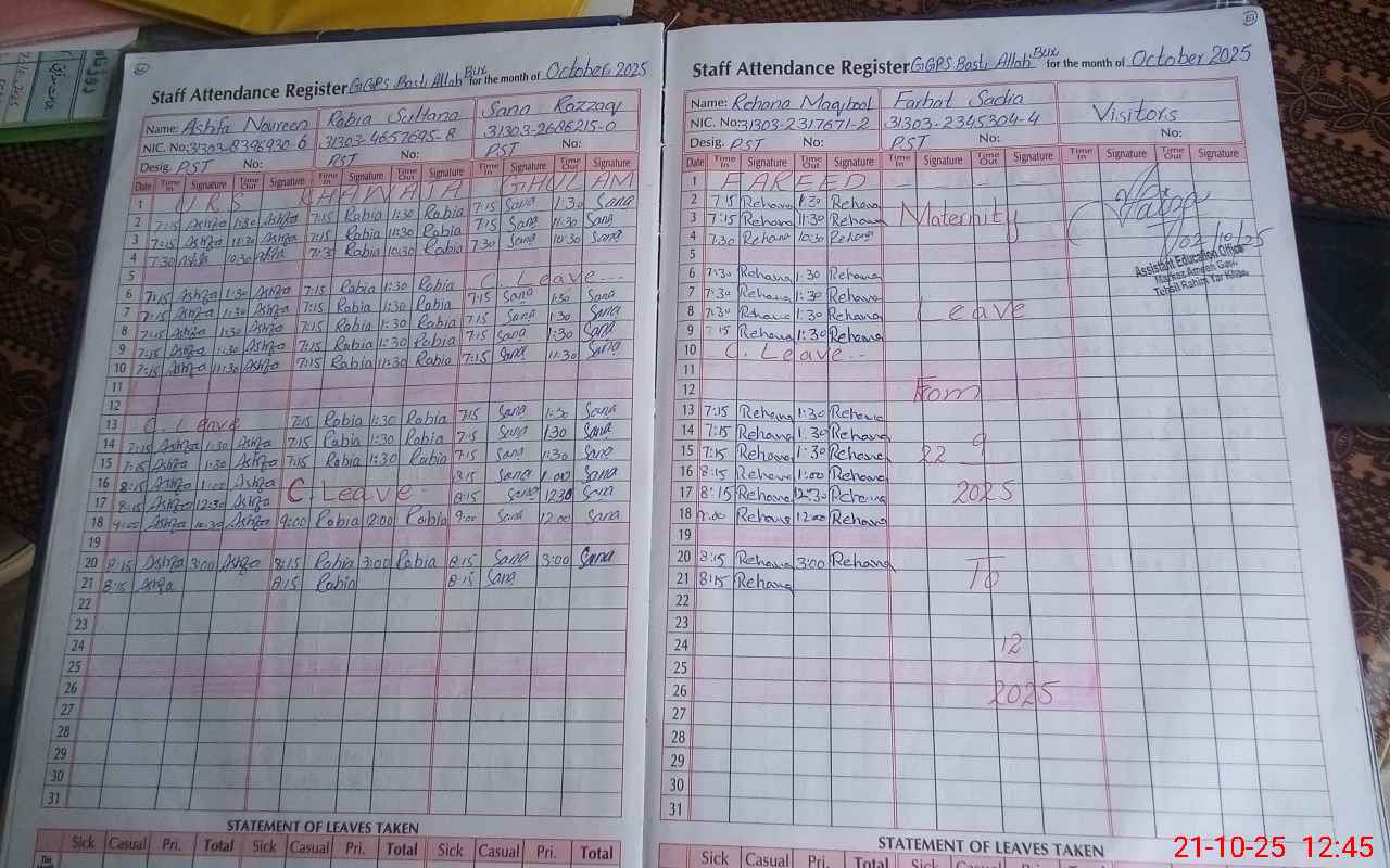 | CNIC | Full Name | Designation | R/C | Absence During Last Calender Month |