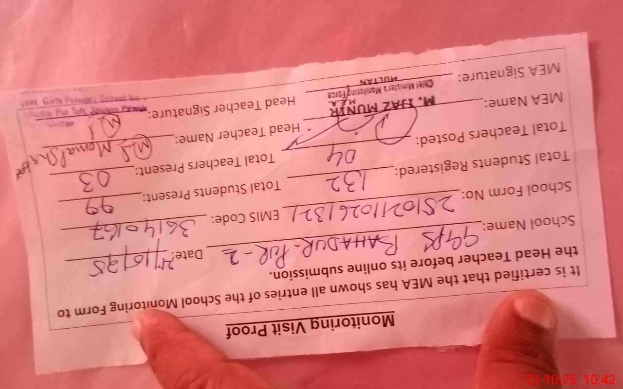 | Attendance Register | Head Teacher | MEA with School | Visit Proof |