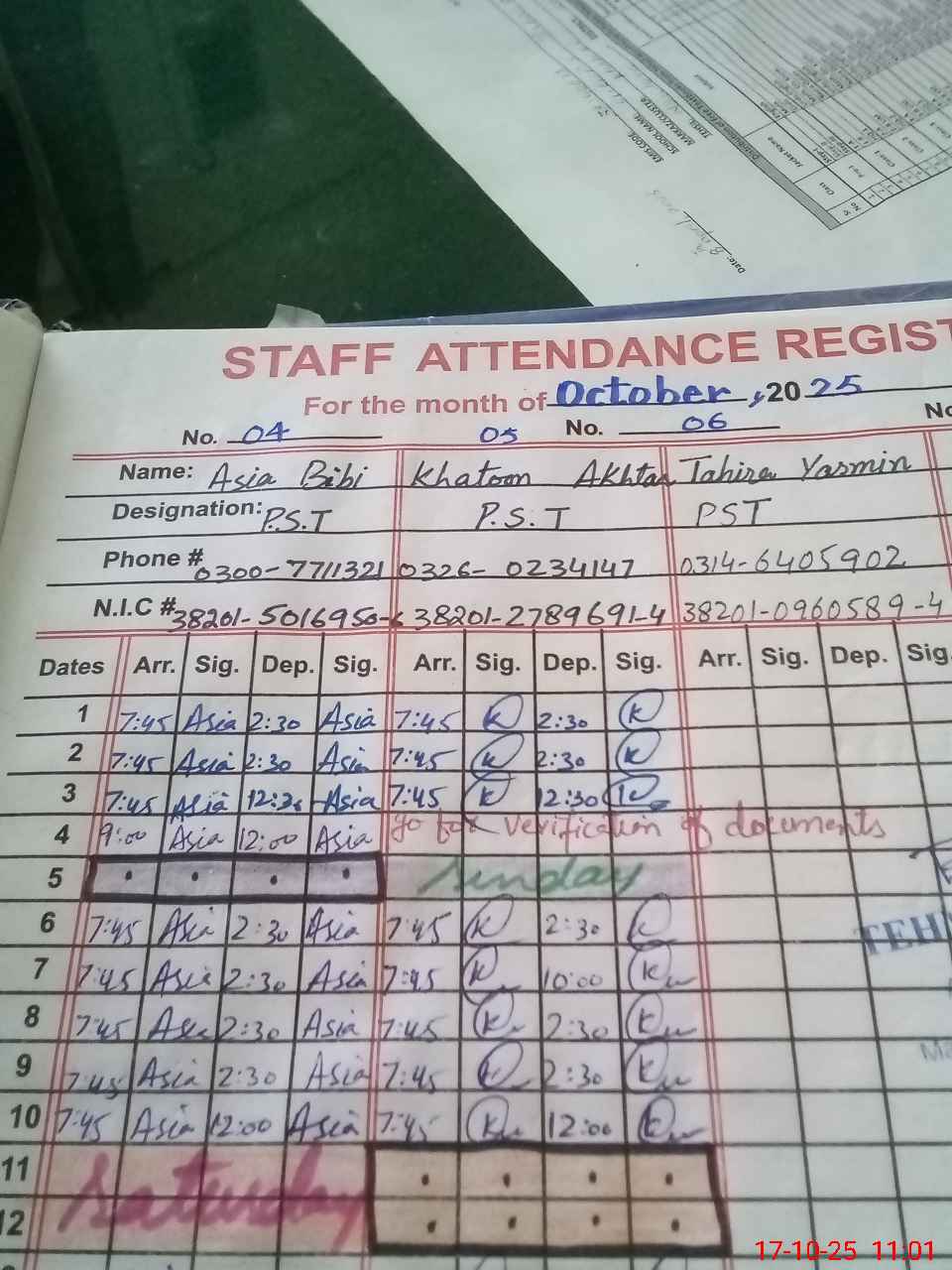 | CNIC | Full Name | Designation | R/C | Absence During Last Calender Month |