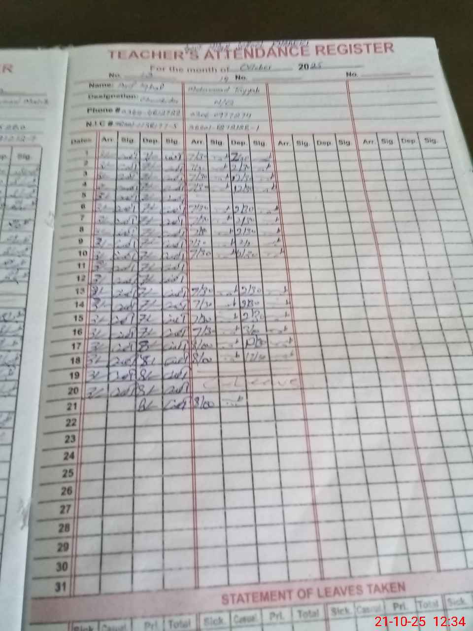 | CNIC | Full Name | Designation | R/C | Absence During Last Calender Month |