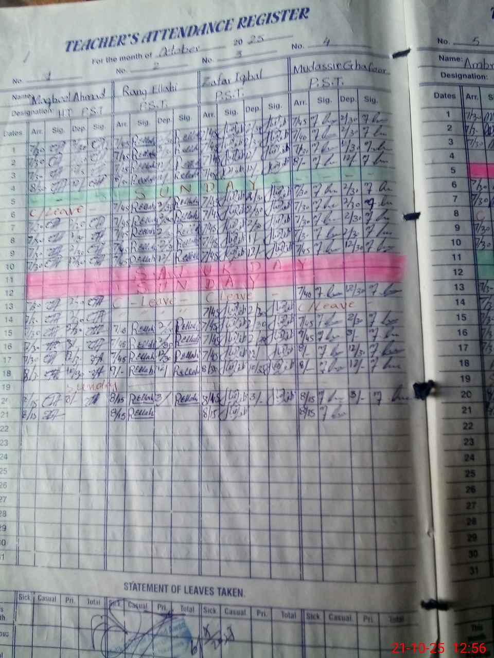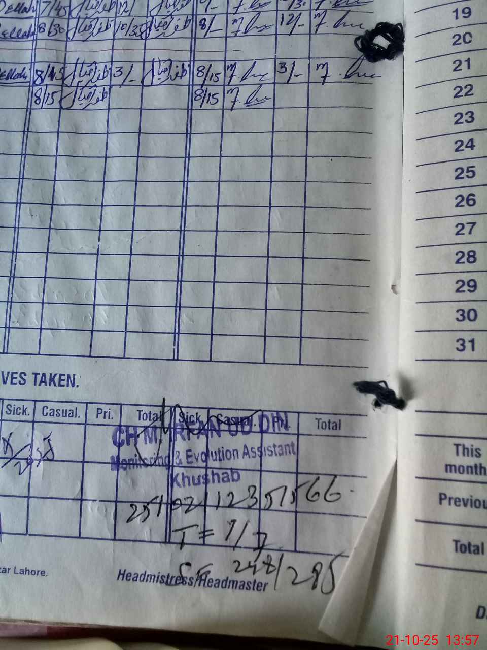 | CNIC | Full Name | Designation | R/C | Absence During Last Calender Month |