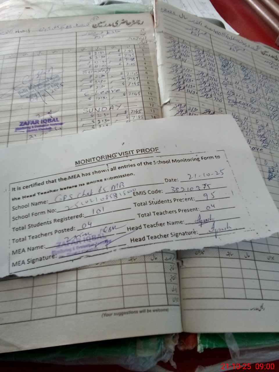 | Attendance Register | Head Teacher | MEA with School | Visit Proof |