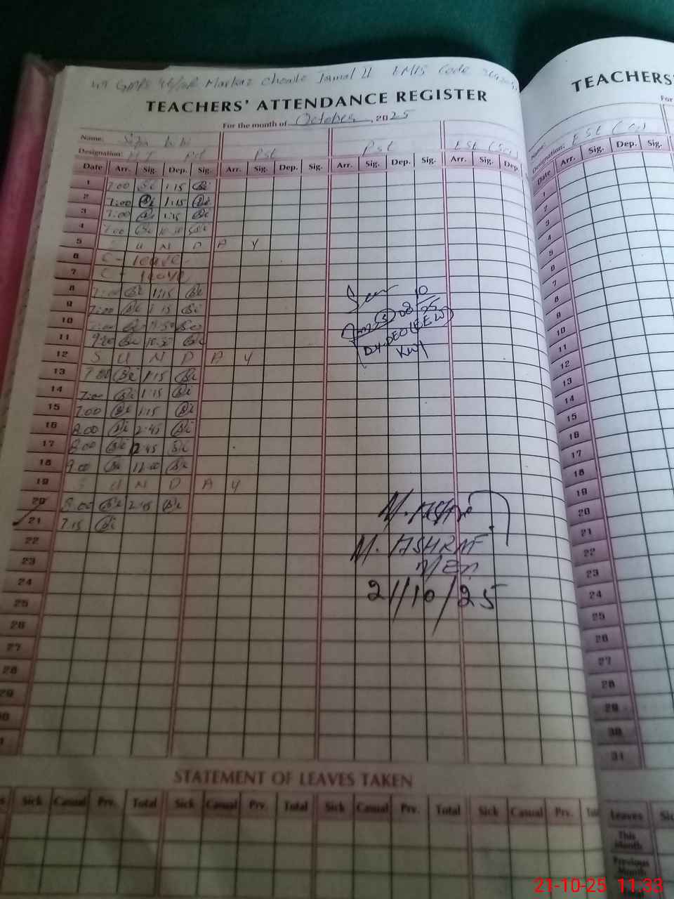 | Remarks (Use Separate Page if Required): According to tab rendom check class 5TH PROMOTED TO NEXT SCHOOL No AEO VISIT last month | |||||