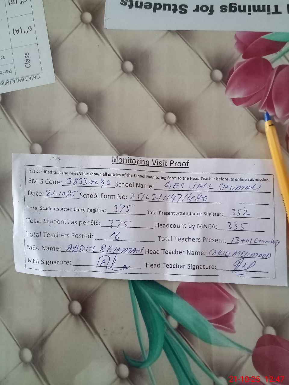 | Attendance Register | Head Teacher | MEA with School | Visit Proof |