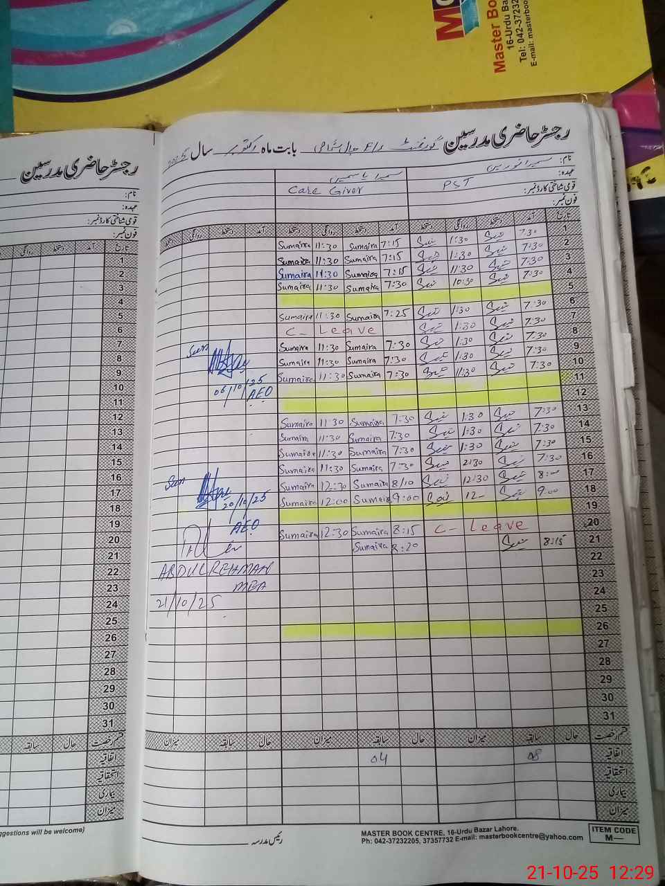 | CNIC | Full Name | Designation | R/C | Absence During Last Calender Month |