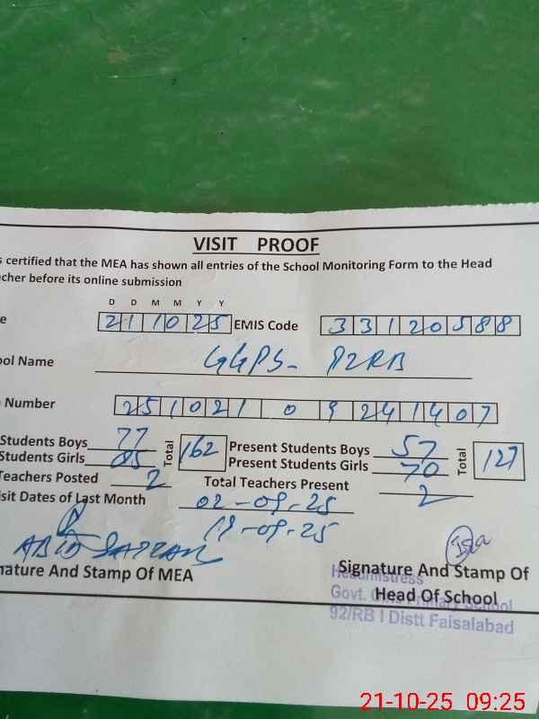| EMIS Code: 33120588 | Name of School: GGPS CHAK 92 RB I KHURRIANWALA | |||