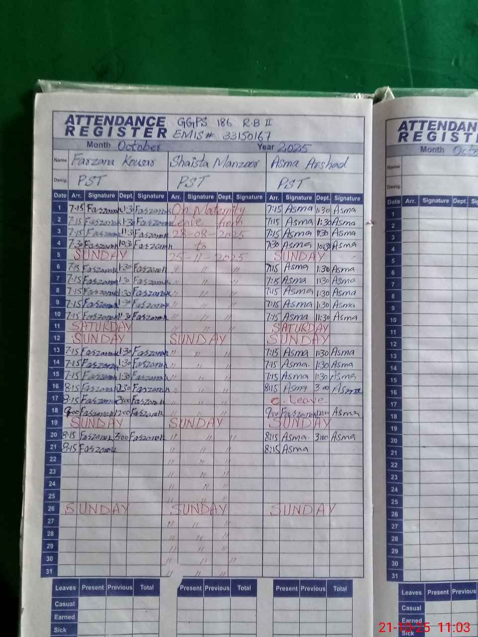 | 33**** | Sh**** Ma**** | PST | Regular | 30 | 0 | 0 | 30 | 0 | 0 | 0 | 0 | 0 | Maternity |
