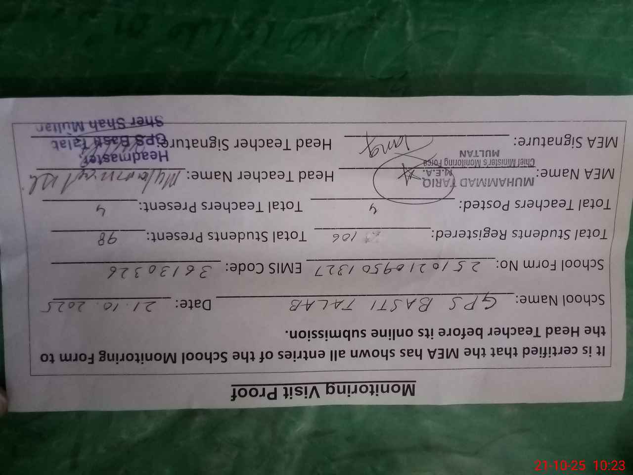 | EMIS Code: 36130326 | Name of School: GPS BASTI TALAB SULTAN PUR HAMER SHER SHAH | |||