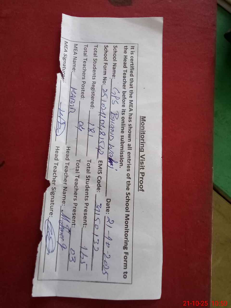 | EMIS Code: 31150132 | Name of School: GPS BHAND WALI | |||