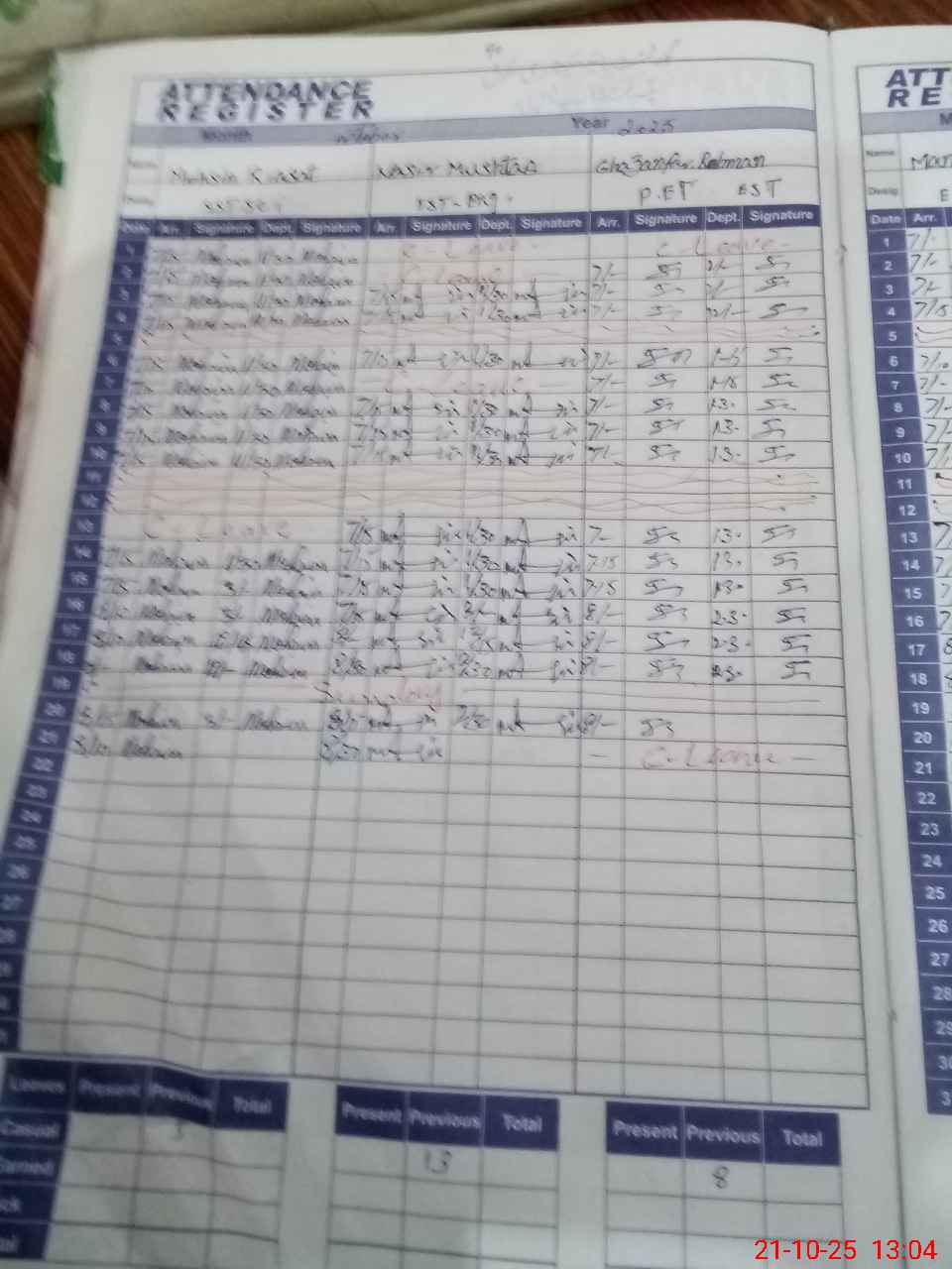 | CNIC | Full Name | Designation | R/C | Absence during last cal. month |