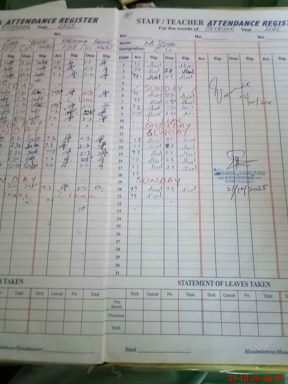 | Remarks (Use Separate Page if Required): Miss saba yousaf and miss farmana bashir leave not approved | |||||