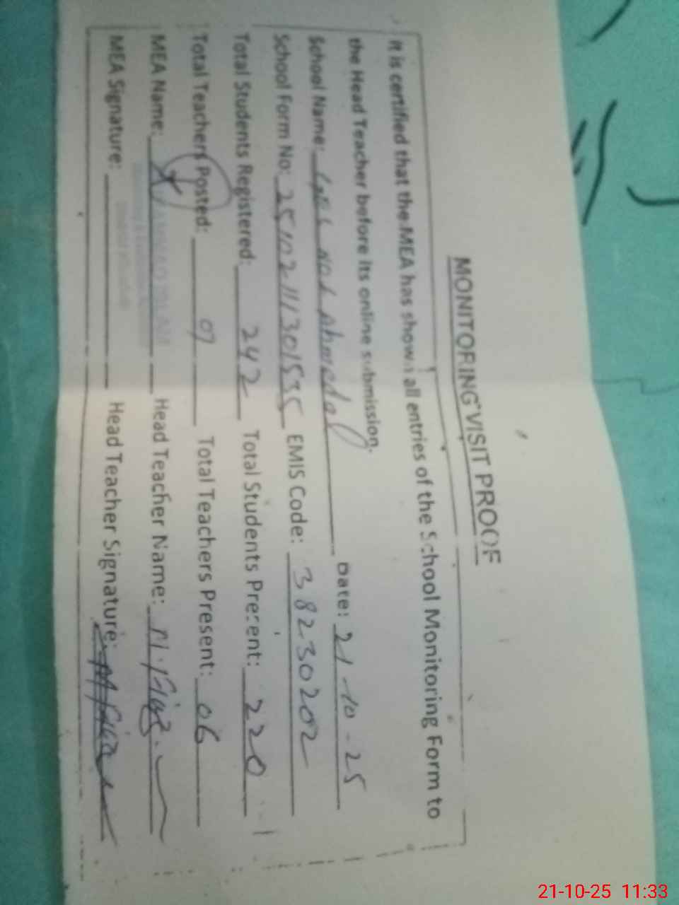 | Attendance Register | Head Teacher | MEA with School | Visit Proof |