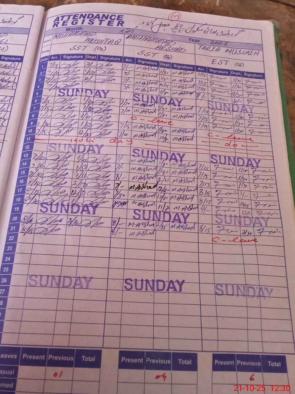 | CNIC | Full Name | Designation | R/C | Absence During Last Calender Month |