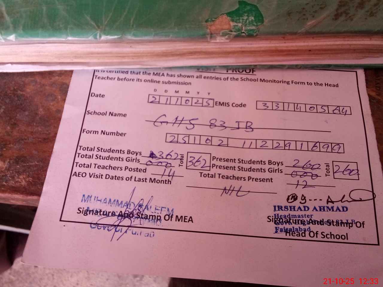 | Attendance Register | Head Teacher | MEA with School | Visit Proof |