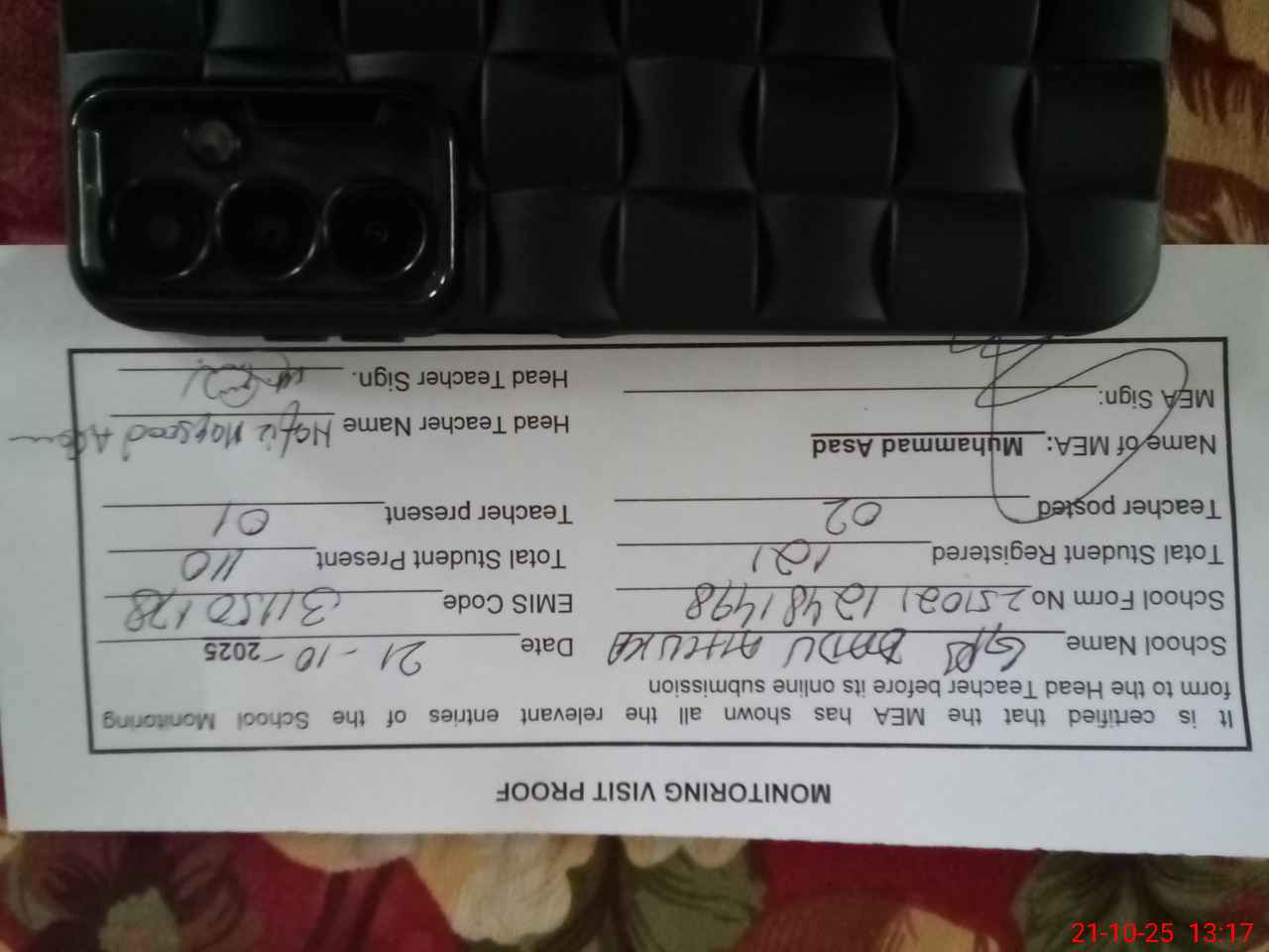 | Attendance Register | Head Teacher | MEA with School | Visit Proof |