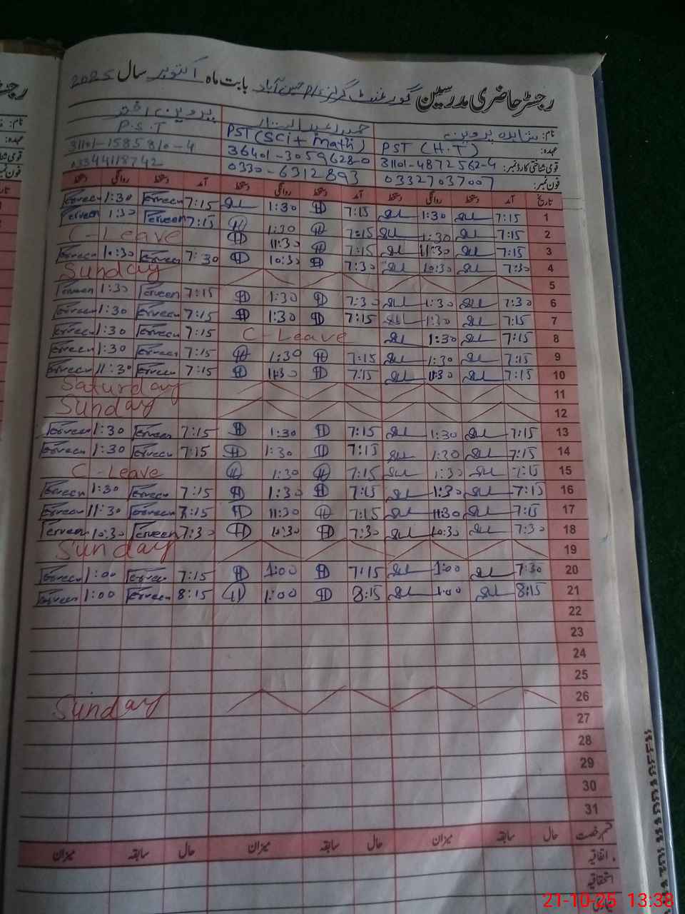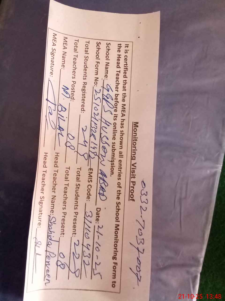 | Name: Sh**** Pa**** Designation: (School Headmaster's/Headmistress's) PST Phone/Cell Number: 03**** |