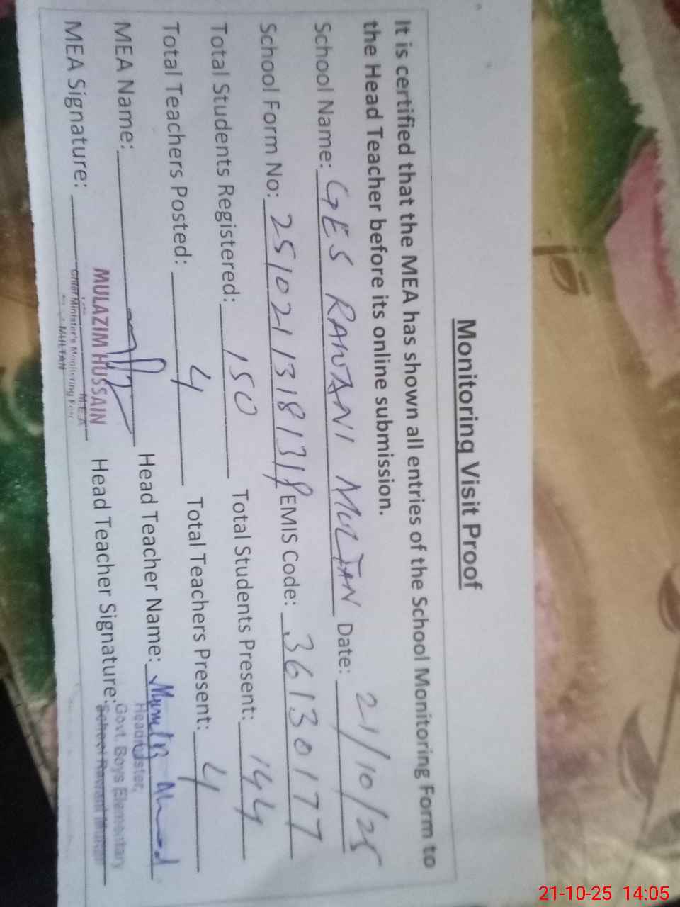| Certified that this School was Inspected by the Undersigned MEA/DMO Today and the Information Stated Above is as Per Record. | |||||