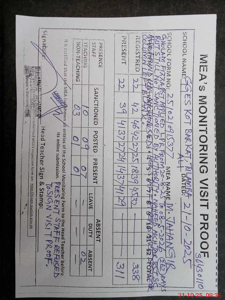| EMIS Code: 36430110 | Name of School: GGES KOT BARKAT ALI, TULAMBA | |||