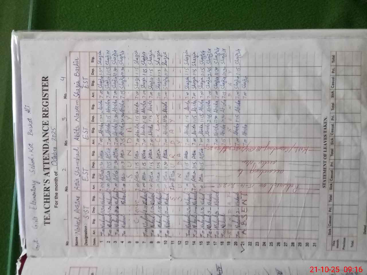 | Remarks (Use Separate Page if Required): GHULAM FIZZA PST APPLIED LPR FROM 20 AUGUST 2025 TO 08 MAY 2026 262 DAYS BUT LEAVE STILL NOT SANCTIONED BY AUTHORITY NAHEED AKHTAR SST SC ALSO FOUND UN AUTHORISED ABSENT FROM DUTY HER STAFF ATTENDANCE REGISTER COLUMN WAS LEFT BLANK RANDOM CLASS FOUR IS NOW IN CLASS SEVEN AND EIGHT PRESENT STAFF REFUSED TO SIGN VISIT PROOF FORM | |||||