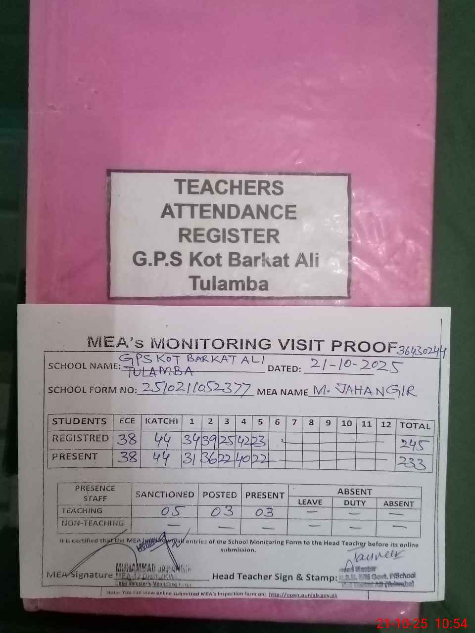 | EMIS Code: 36430244 | Name of School: GPS KOT BARKAT ALI, TULAMBA | |||