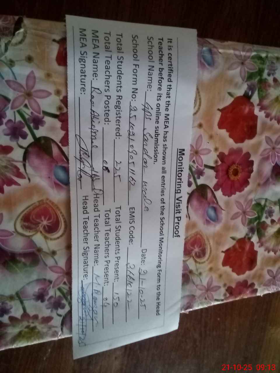 | Remarks (Use Separate Page if Required): Teacher Syed Mahammad Ismail Shah PST is performing his duty in this school wef 8th February 2025 To Visit date but his name not in MEA Monitoring Aap and same teacher is performing duty PSER Servay | |||||