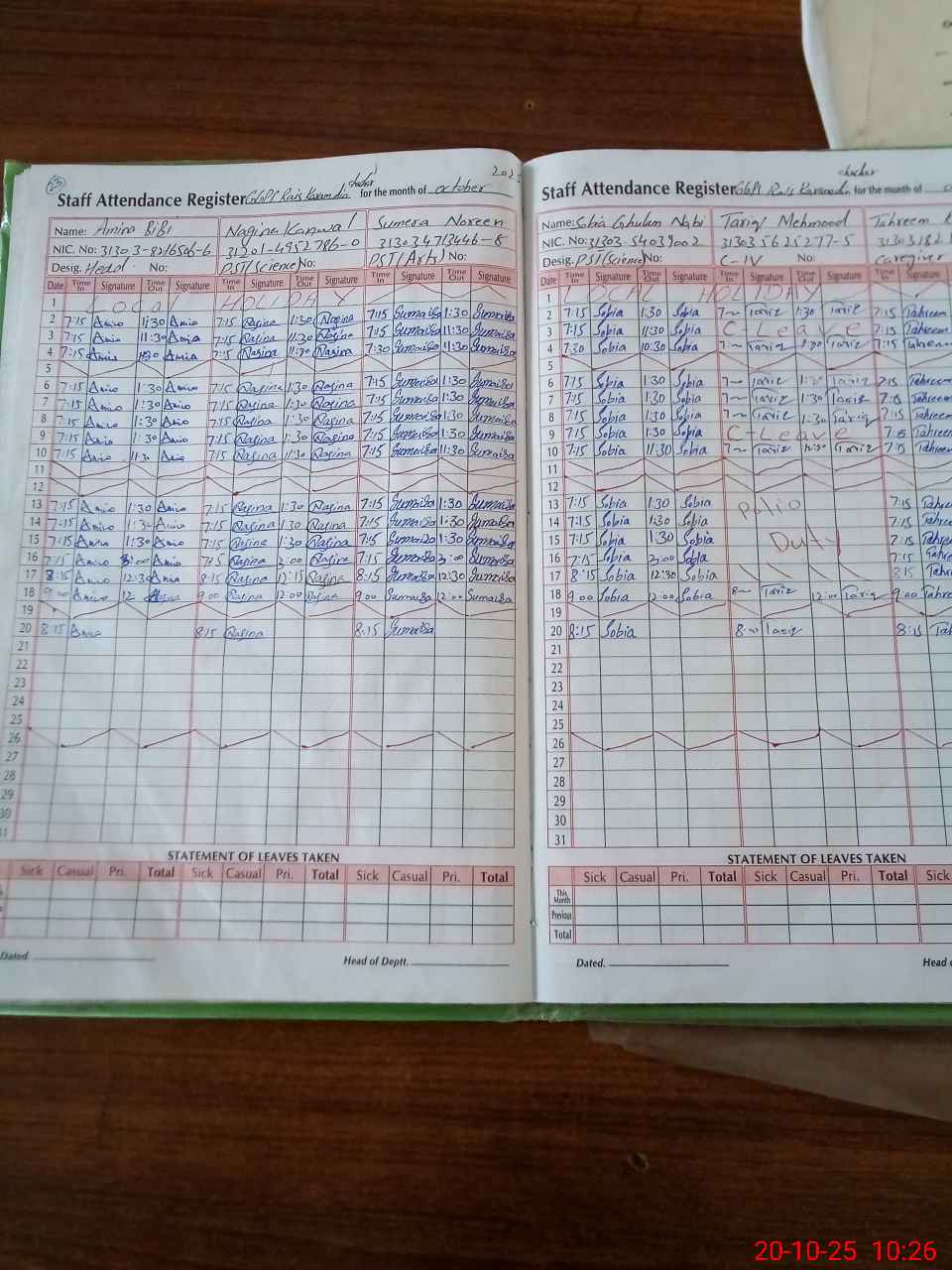| CNIC | Full Name | Designation | R/C | Absence During Last Calender Month |