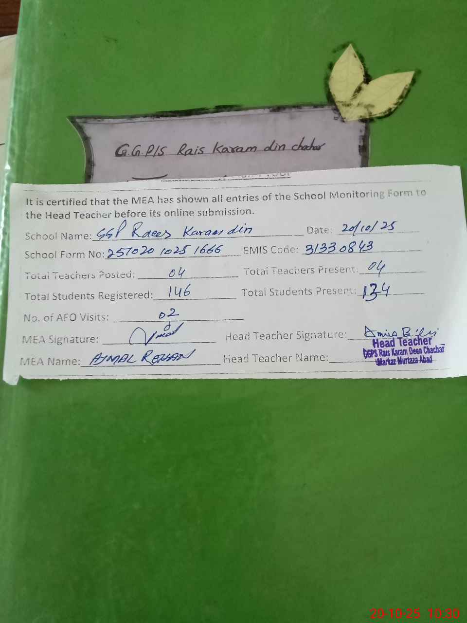 | Attendance Register | Head Teacher | MEA with School | Visit Proof |